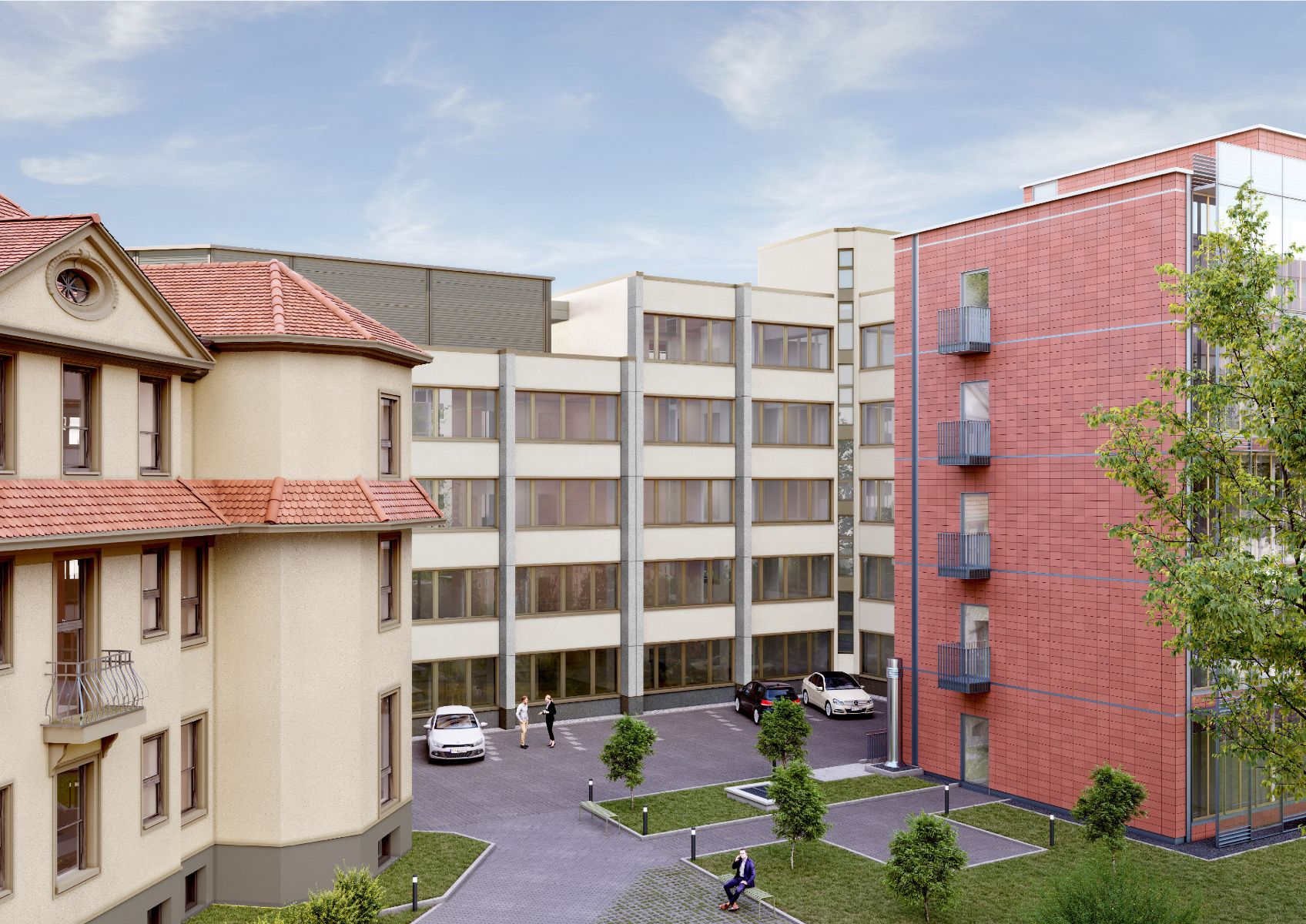 Die Fassade des denkmalgeschützten Altbaus und die Fenster wurden nach historischem Vorbild saniert. Die Fertigstellung der energetisch sanierten Fassade von Haus 15 wird im vierten Quartal 2023 erfolgen, ebenso wie die Inbetriebnahme der auf Haus 15 befindlichen Photovoltaik-Anlage. Die geschützte rückwärtige Parkanlage mit historischem Brunnen und Pavillon wird zur nächsten Vegetationsperiode hergerichtet und bietet den neuen Nutzern im Außenbereich des Büroensemble eine hohe Aufenthaltsqualität. Für Elektroautos und Fahrräder wurde ein Parkraum im Innenhof mit E-Ladestationen geschaffen.